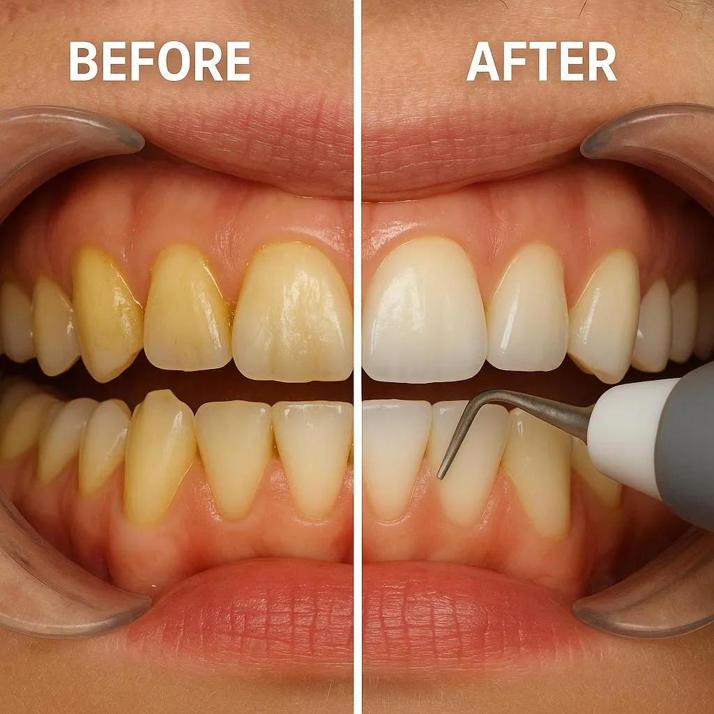 - Scaling – Removal of tartar (hardened plaque) above and below the gum line
